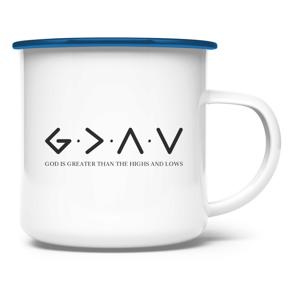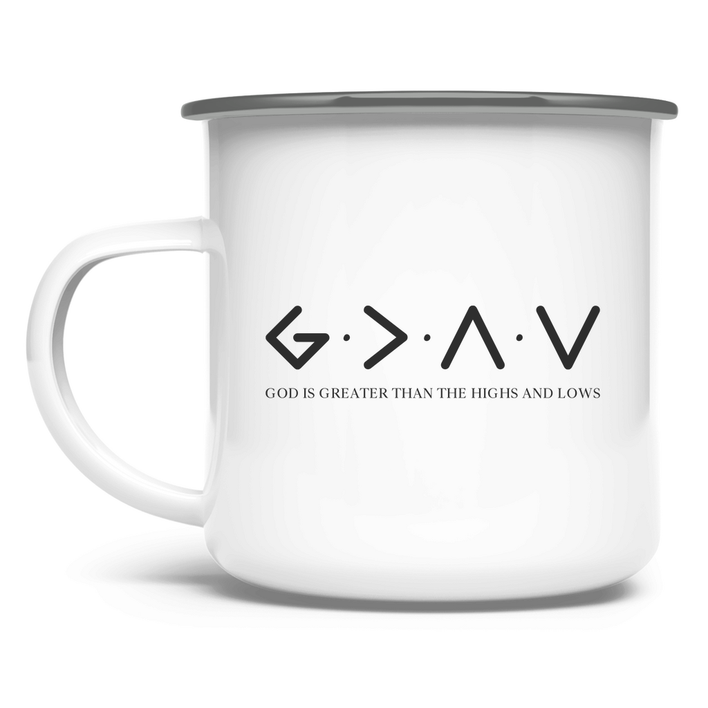 Emaille Tasse god is greater than the highs and lows