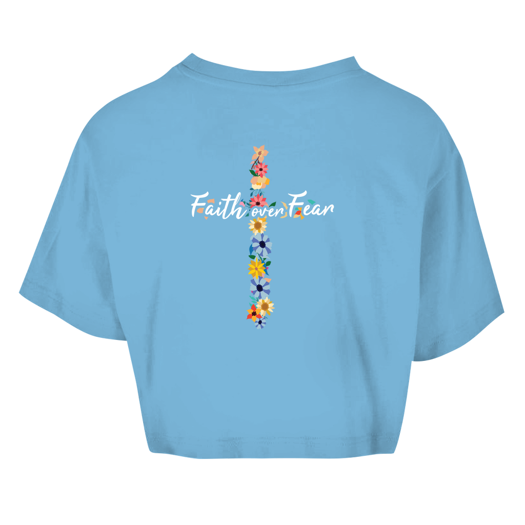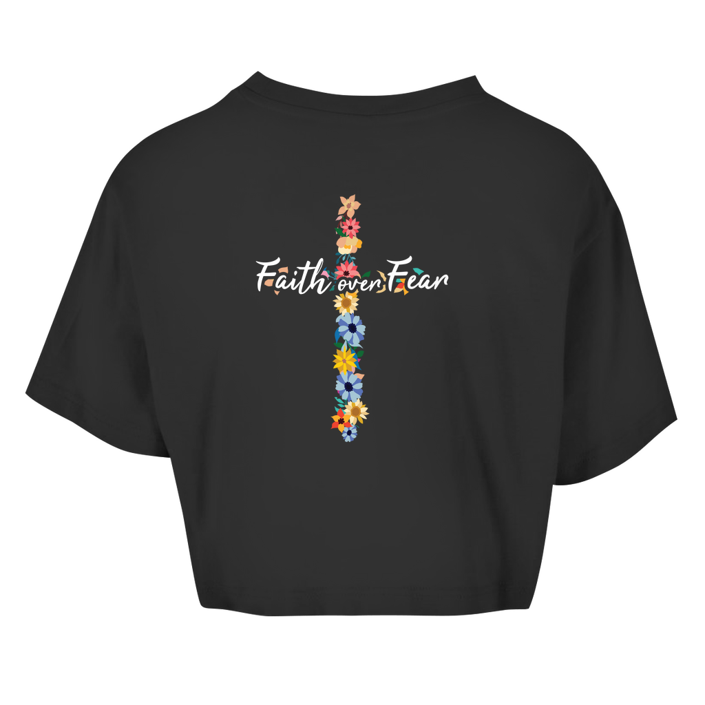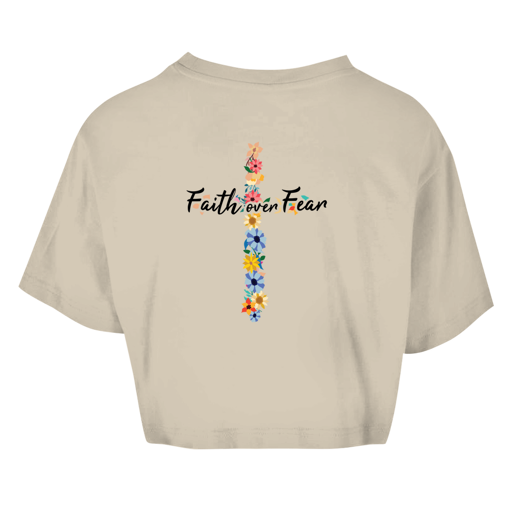Damen Oversize Crop Top faith over fear blumen kreuz